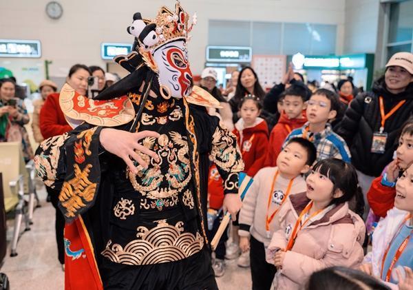 1月30日,Y987次“非遺主題”熊貓專列出發(fā)前,變臉演員正在與小游客互動(dòng)。孟寬/攝