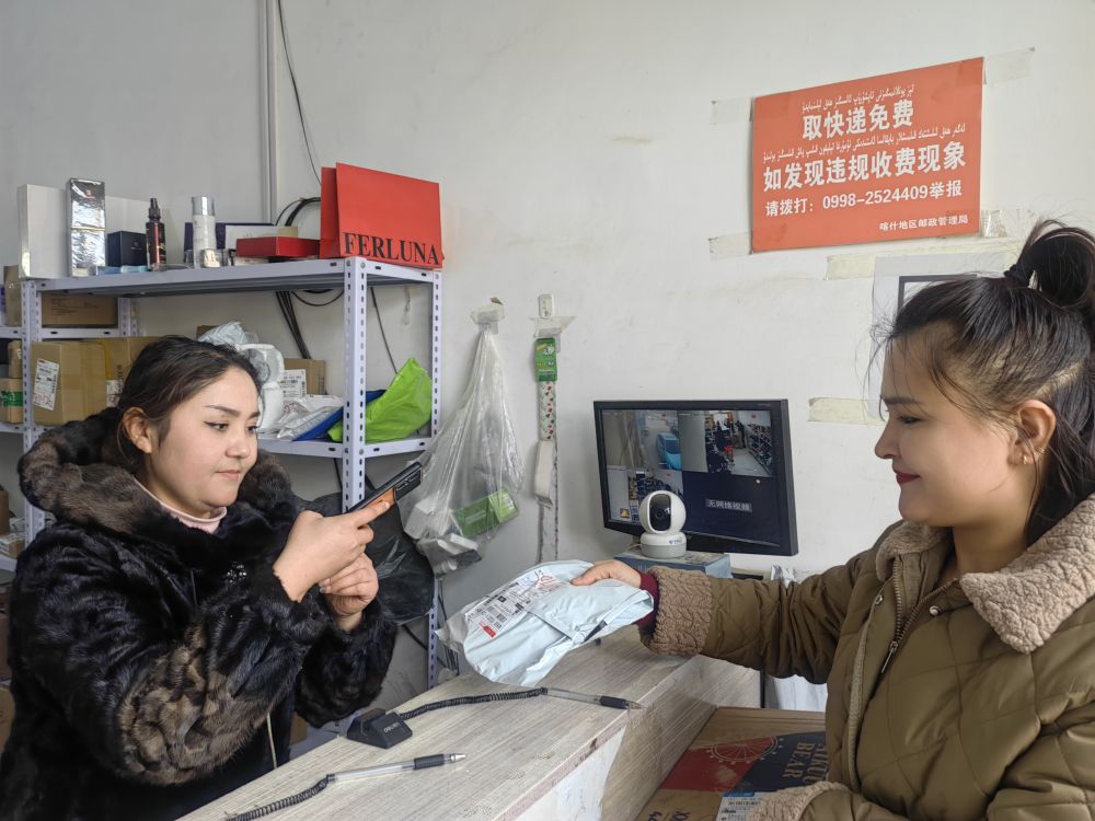 這是1月18日拍攝的新疆喀什市荒地鄉(xiāng)一快遞代收點(diǎn)顧客取快遞照片。新華社記者蔡國(guó)棟 攝