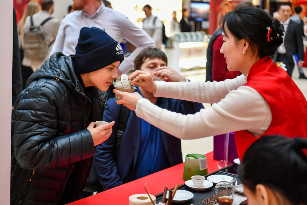 1月28日,在俄羅斯莫斯科舉行的新春廟會(huì)活動(dòng)上,游客在感受茶文化。新華社記者曹陽攝