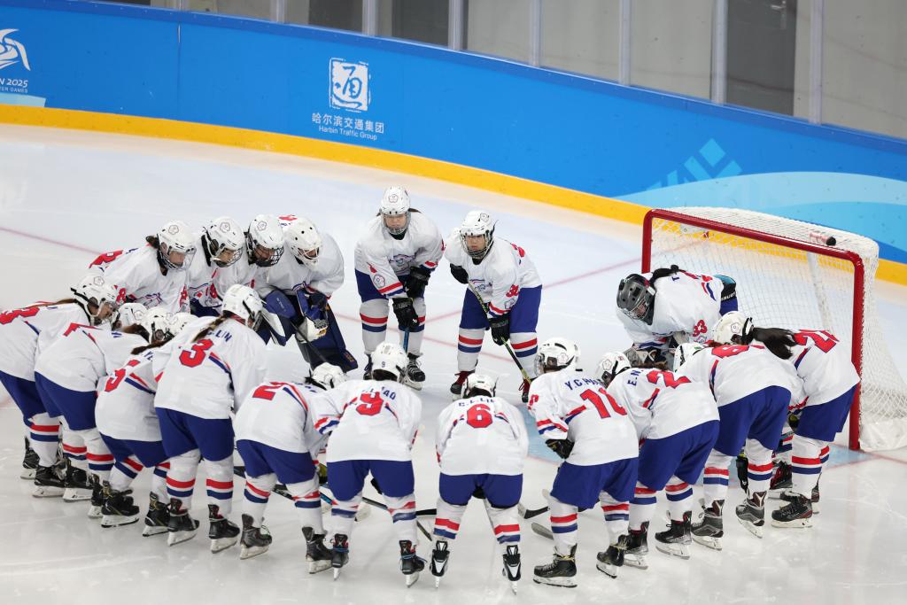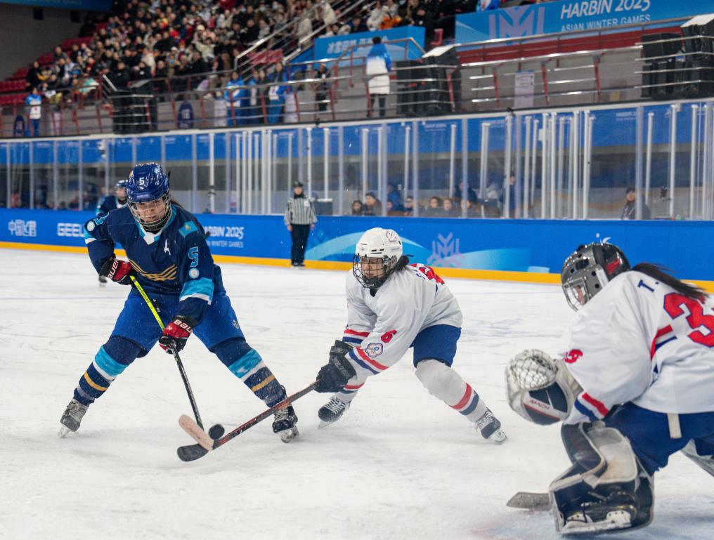 2月6日,在哈爾濱體育學院舉行的2025年第九屆亞冬會女子冰球小組賽B組比賽中,中國臺北隊1:5不敵哈薩克斯坦隊。新華社記者 孫非 攝