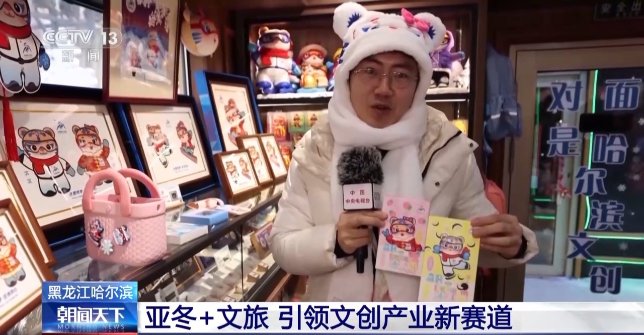 總臺記者 張程:我發(fā)現(xiàn)第九屆亞冬會的文創(chuàng)產(chǎn)品有兩個(gè)特點(diǎn),第一就是完美地嵌入到我們的生活當(dāng)中:比如說我現(xiàn)在頭上戴的這頂妮妮圖案的帽子,采用了石墨烯加熱技術(shù),保證你在戶外也能夠抵御“爾濱”的嚴(yán)寒。