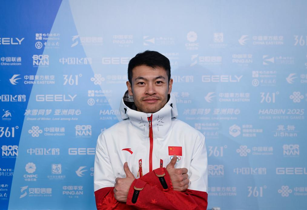 2月6日,哈爾濱亞冬會開幕式中國體育代表團(tuán)旗手寧忠?guī)r在黑龍江省冰上訓(xùn)練中心速滑館接受集體采訪。新華社記者 陳振海 攝