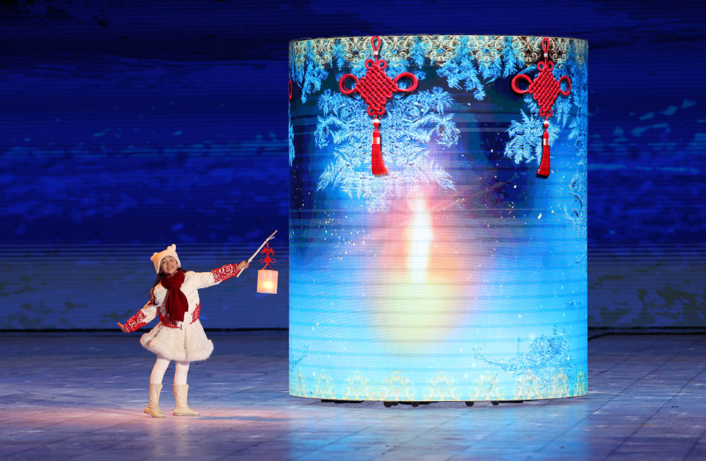 一個穿白衣裙、戴紅圍巾的女孩提著盈盈微光的小冰燈,點亮舞臺中央的大冰燈。隨后,34名孩童手提冰燈圍合環(huán)抱在一起,象征本屆亞冬會34個亞洲參賽國家和地區(qū)凝心聚力,共同點亮夢想。