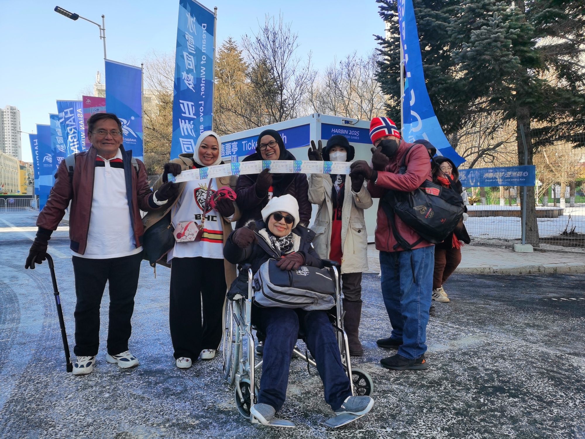 阿伊莎(后排左二)一家六口在亞冬會賽場外合影