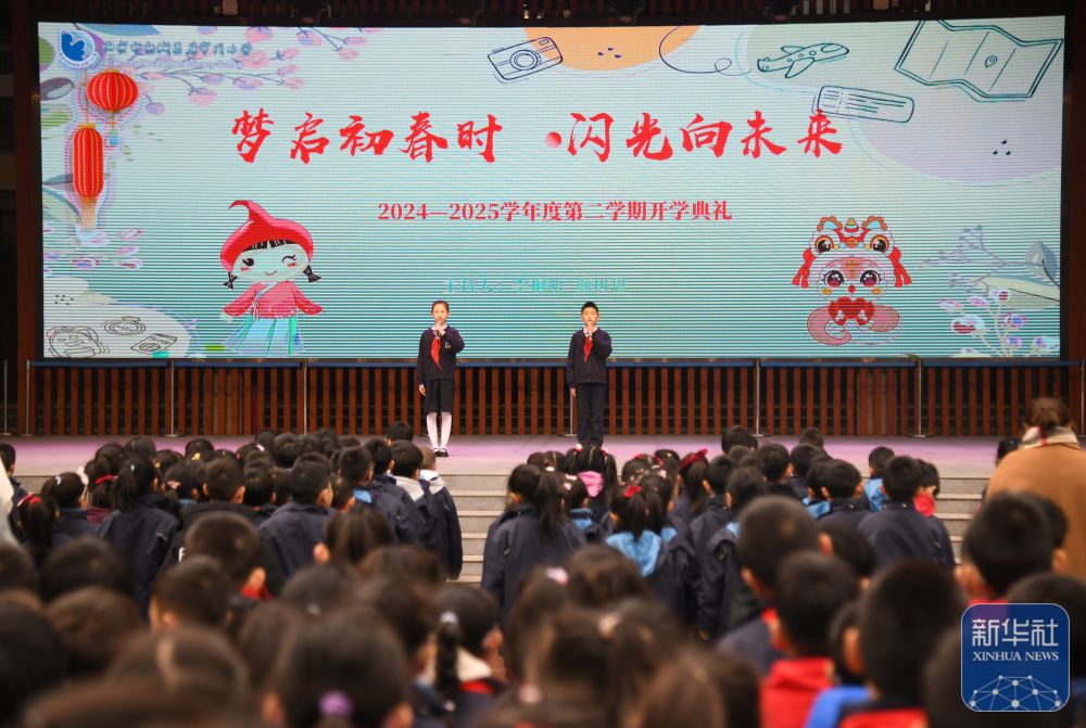 2月14日,西安市后宰門小學(xué)學(xué)生主持新學(xué)期開學(xué)典禮。新華社記者 張博文 攝