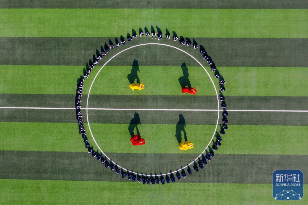 2月14日,山東省淄博科技學(xué)校龍獅社團的學(xué)生在操場上進行舞獅演練(無人機照片)。新華社發(fā)(張維堂攝)