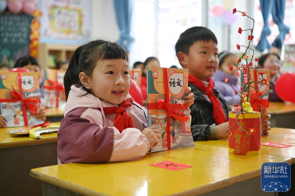 2月14日,在河南省沁陽市朱載堉學(xué)校,一年級學(xué)生展示領(lǐng)到的新課本。新華社發(fā)(楊帆攝)