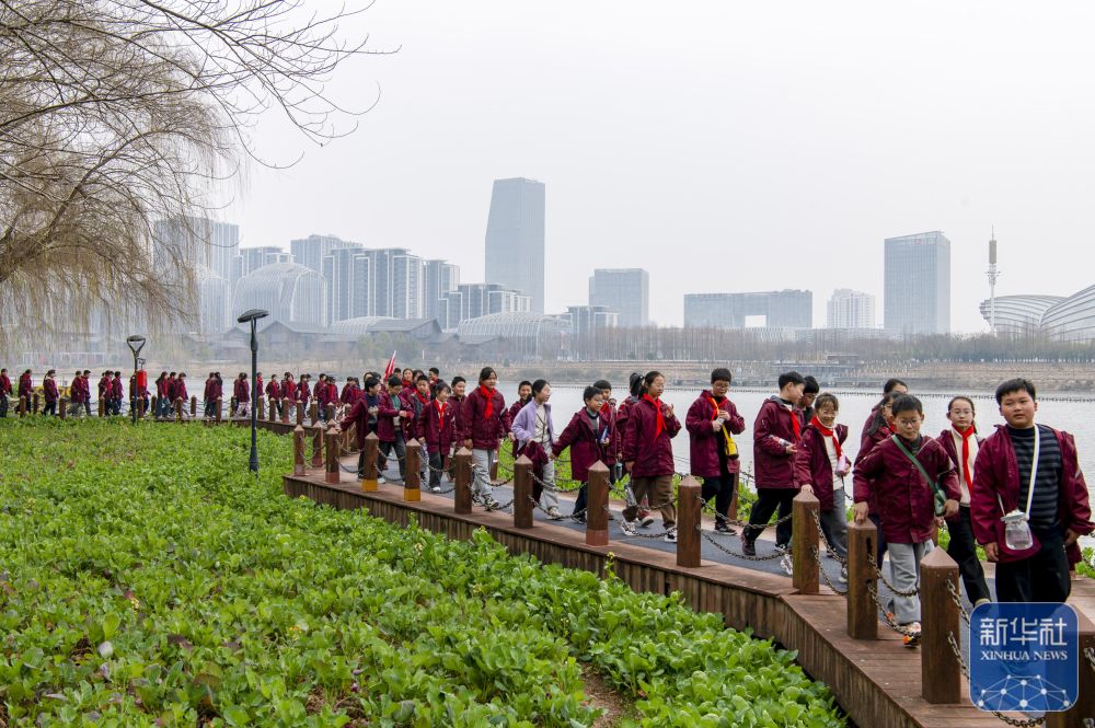 2月14日,在浙江省金華市婺城區(qū)婺州公園里,東市街小學(xué)師生集體在三江六岸綠道上快樂毅行。新華社發(fā)(胡肖飛攝)