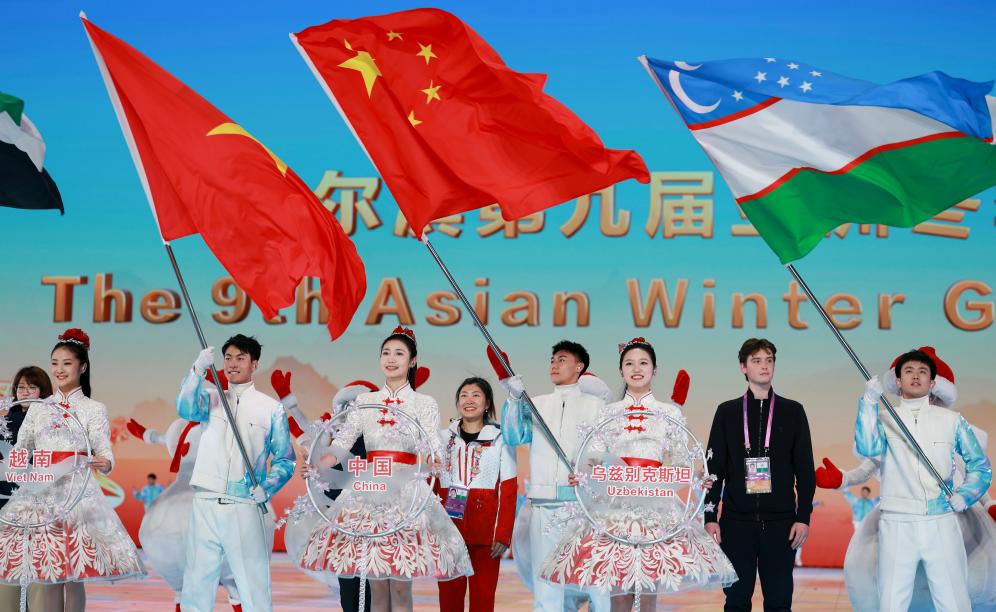 2月14日,第九屆亞洲冬季運動會閉幕式在哈爾濱舉行,這是各體育代表團入場環(huán)節(jié)。新華社記者 許雅楠 攝