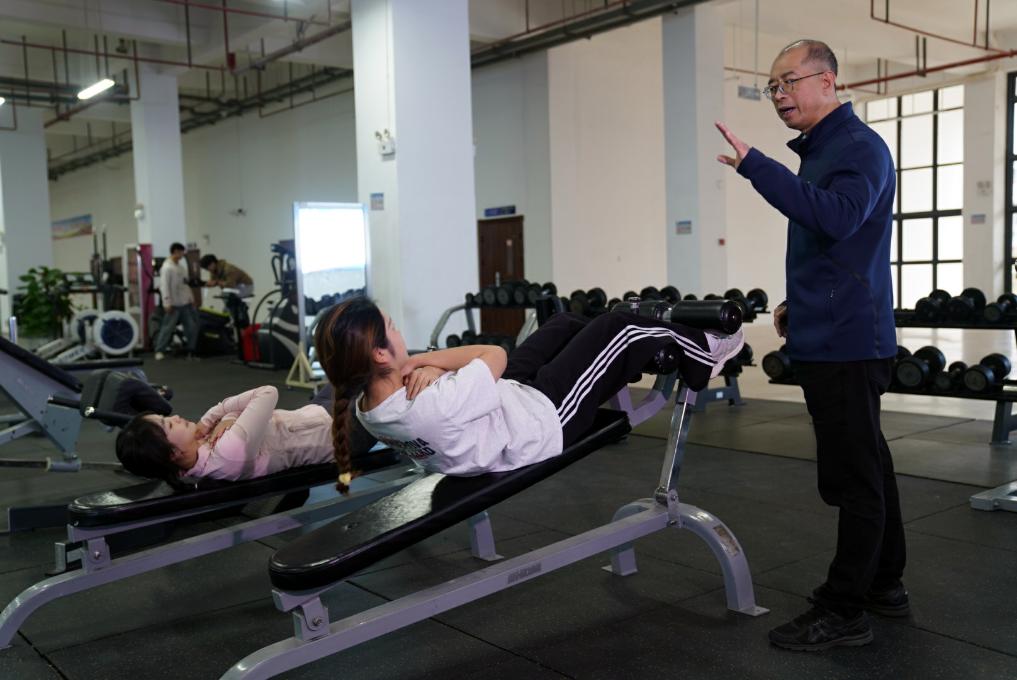2月17日,在廣西體育高等??茖W(xué)校,韋軍在指導(dǎo)學(xué)生進行體育鍛煉。新華社記者 陳露緣 攝
