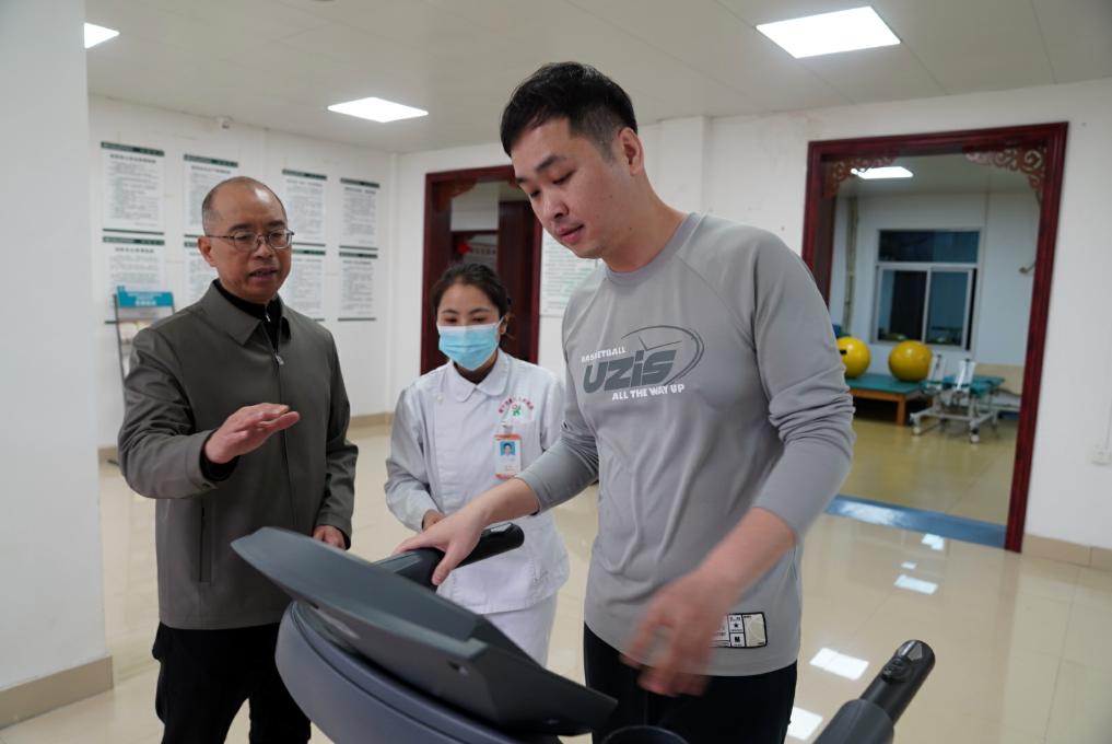 2月18日,韋軍在廣西南寧市西鄉(xiāng)塘區(qū)衡陽街道南鐵社區(qū)衛(wèi)生服務(wù)中心走訪,了解衛(wèi)生服務(wù)中心對群眾進行運動指導(dǎo)的情況。新華社記者 陳露緣 攝