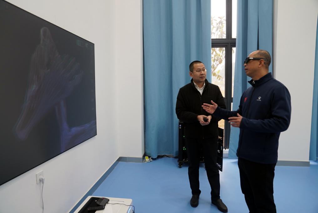 2月17日,在廣西體育高等專科學(xué)校,韋軍與運動健康學(xué)院的老師交流,了解3D模擬運動解剖模型如何助力教學(xué)。新華社記者 陳露緣 攝