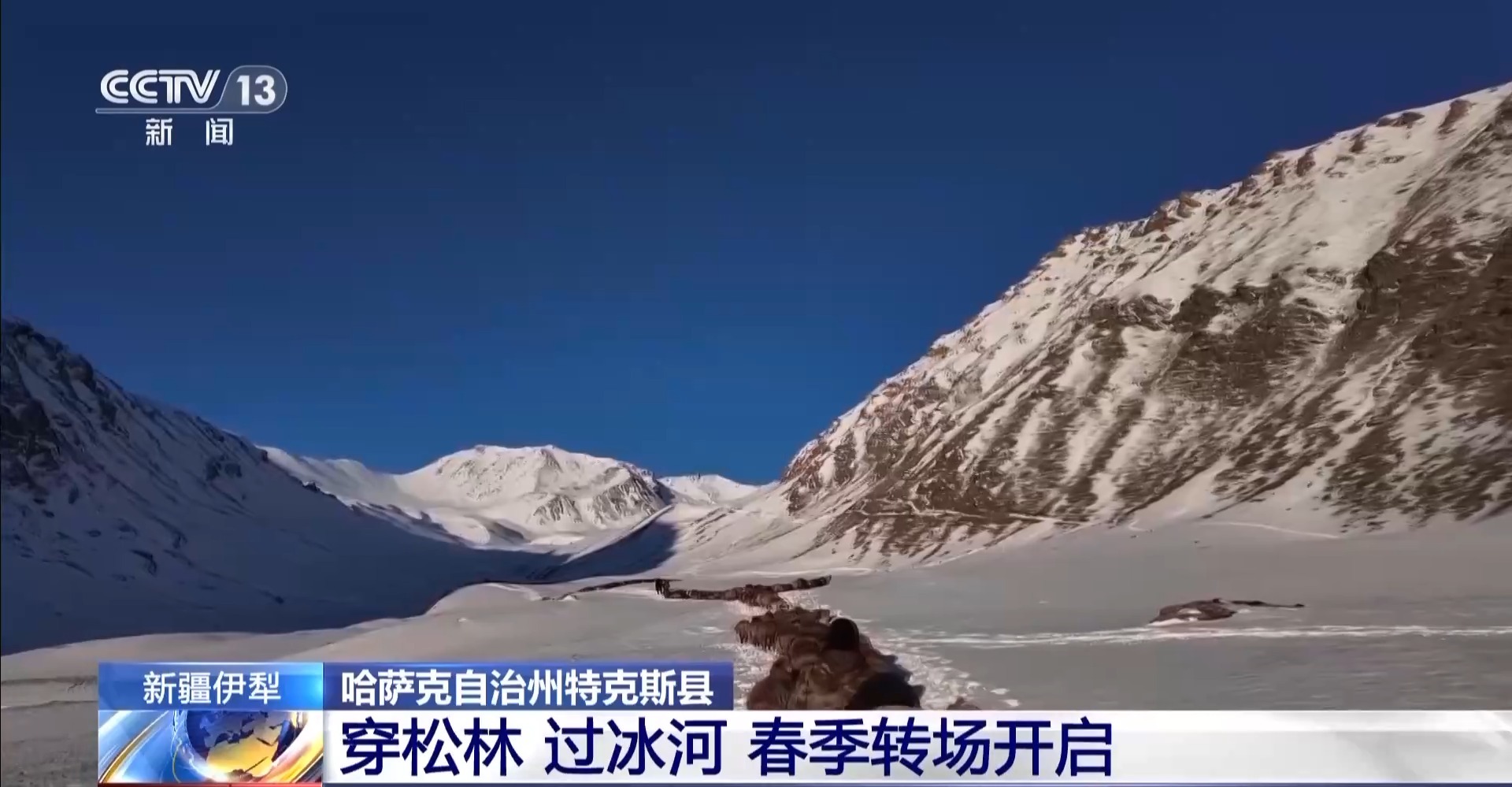 這幾天,新疆伊犁哈薩克自治州特克斯縣11.7萬只牲畜開啟春季轉(zhuǎn)場,當?shù)啬撩駛冓s著牲畜跨越海拔3800多米的喬拉克阿蘇達坂,從伊犁河谷最大的冬牧場——包扎得爾冬牧場趕往春牧場或者定居點。一路上穿松林、過冰河,路途艱辛。