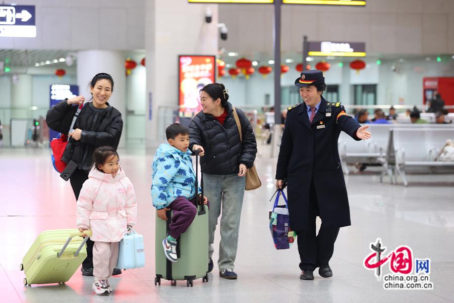 2025年春運(yùn)期間 ,南昌站工作人員為旅客指引候車位置。中國(guó)網(wǎng)發(fā) 劉慕/攝
