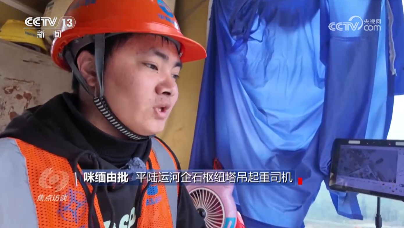 平陸運(yùn)河企石樞紐塔吊起重司機(jī)咪緬由批:“第一次爬的時(shí)候是40米的那種(塔吊),剛開始就是特別害怕,腿也是發(fā)抖,一步一個(gè)腳印,就是冒著汗慢慢爬上來,然后練成了這個(gè)膽量,慢慢就習(xí)以為常了。”