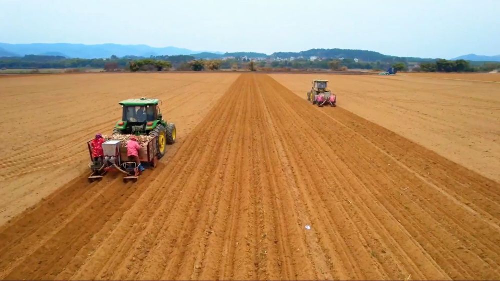 2月19日,在廣西來賓市興賓區(qū)鳳凰鎮(zhèn)國家現(xiàn)代農(nóng)業(yè)產(chǎn)業(yè)園黃安優(yōu)質(zhì)“雙高”糖料蔗基地,七臺大型拖拉機、甘蔗種植機并列同步作業(yè),蔗農(nóng)有條不紊地往入口糟插入蔗苗,機器自動完成植苗、蓋膜、覆土工作,不到15分鐘,兩壟長約200米的甘蔗全部種植完畢。