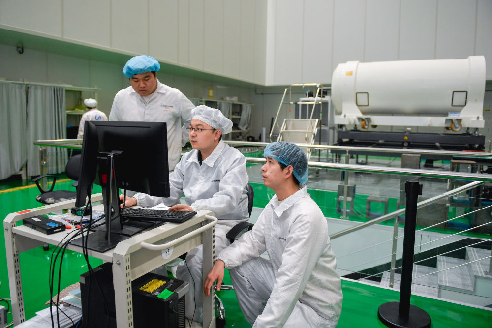 在長光衛(wèi)星相機(jī)裝調(diào)間,王升(右二)在調(diào)試衛(wèi)星光學(xué)遙感載荷組件時與團(tuán)隊(duì)成員討論細(xì)節(jié)。
