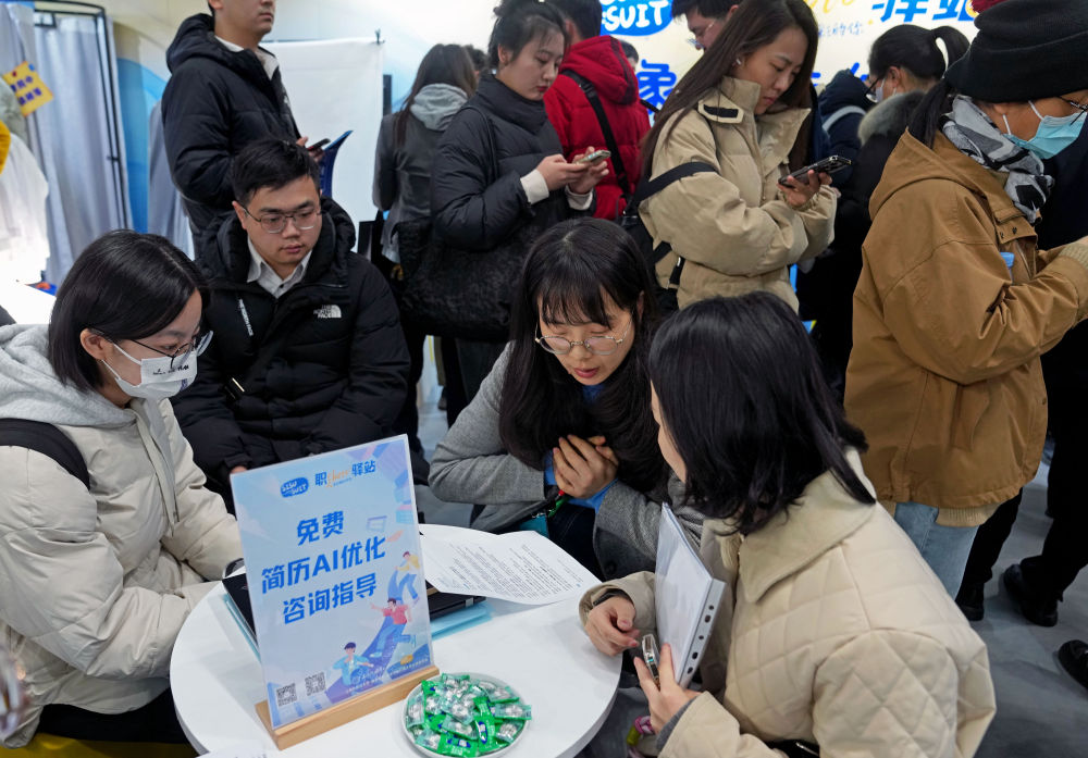 在上海一個大型招聘會現(xiàn)場,工作室團(tuán)隊(duì)為求職者進(jìn)行簡歷優(yōu)化指導(dǎo)。