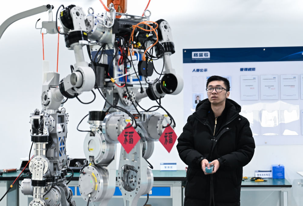 2月24日,湖北武漢格藍(lán)若智能技術(shù)股份有限公司員工在調(diào)試人形機(jī)器人。新華社記者杜子璇 攝