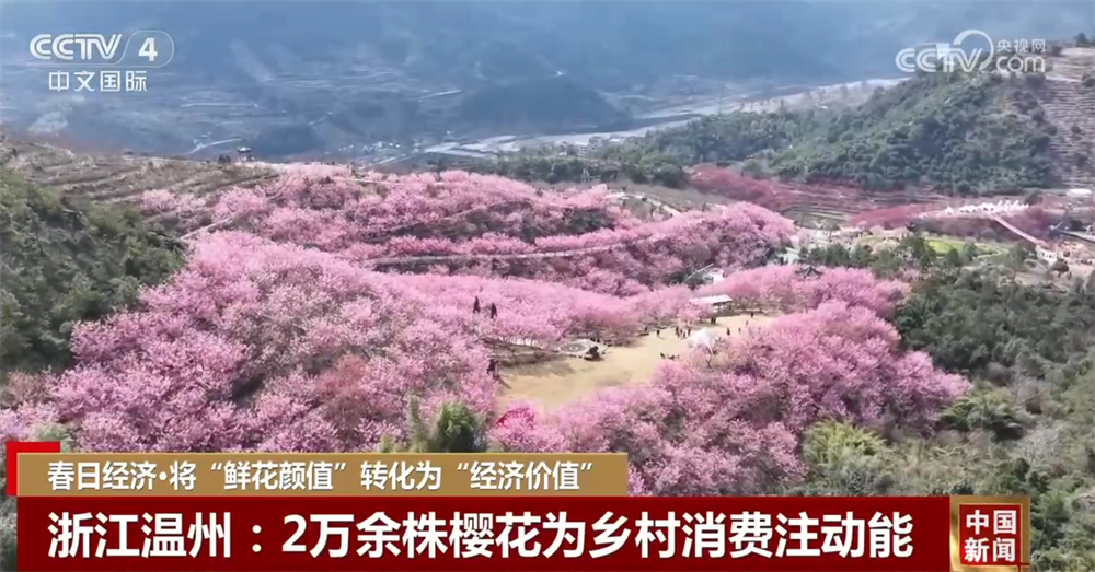 浙江省永嘉縣的溫州櫻花園占地3600畝,已開發(fā)利用1700多畝,種植了2萬(wàn)余株櫻花,品種涵蓋臺(tái)灣牡丹櫻、紅粉佳人櫻等數(shù)十個(gè)品種。盛開的櫻花吸引了游客,也帶動(dòng)了當(dāng)?shù)夭惋?、住宿、旅游、交通等服?wù)消費(fèi)快速增長(zhǎng),自2月13日開園以來(lái),櫻花園日均接待游客近3000人次,周末更是突破1萬(wàn)多人。