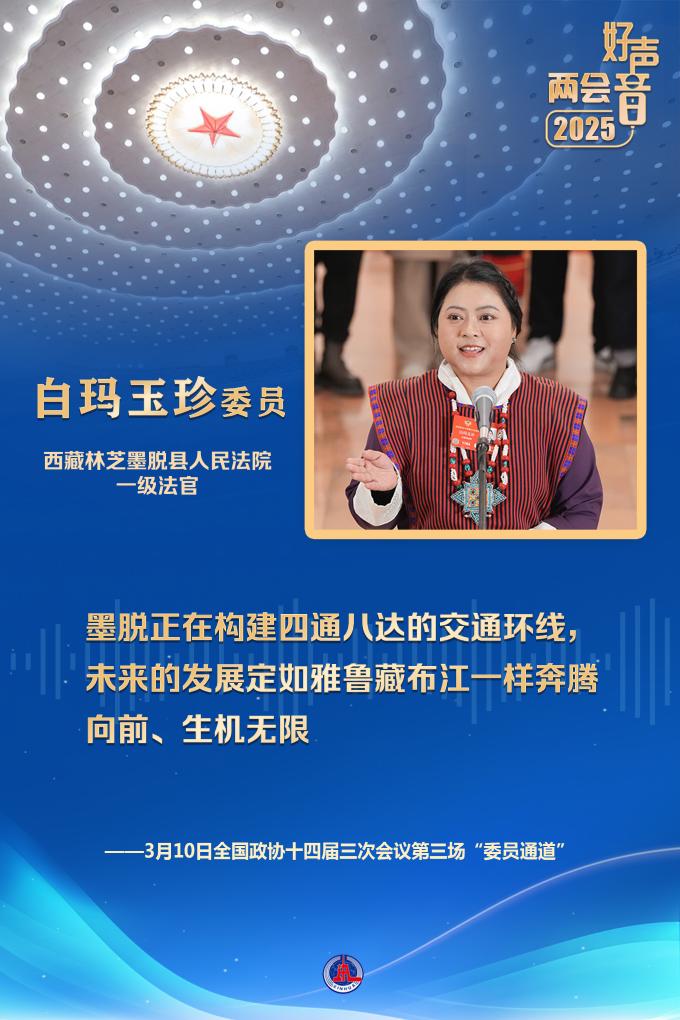 白瑪玉珍委員來自全國最后一個通公路的縣——西藏墨脫。她說,墨脫實現(xiàn)了從“高原孤島”向“美麗邊城”的時代蛻變,家家戶戶用上了干凈水、穩(wěn)定電、高速網(wǎng),老百姓吃上了“生態(tài)旅游飯”,增收的路子越來越寬。