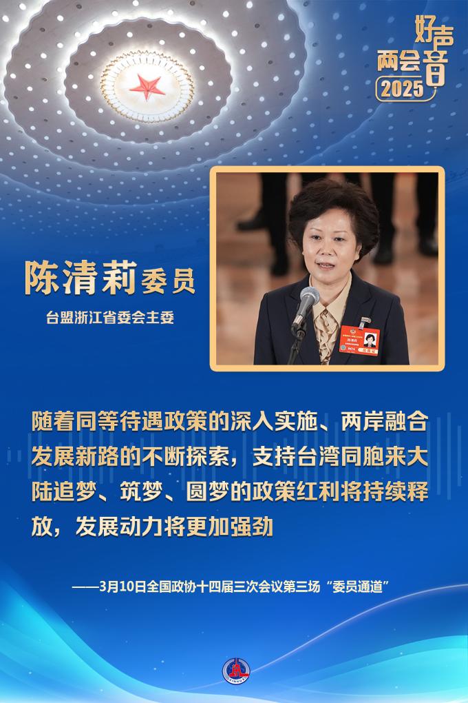 臺盟浙江省委會主委陳清莉委員分享了臺灣同胞在浙江生活、創(chuàng)業(yè)的故事。她表示,隨著同等待遇政策的深入實施、兩岸融合發(fā)展新路的不斷探索,支持臺灣同胞來大陸追夢、筑夢、圓夢的政策紅利將持續(xù)釋放,發(fā)展動力將更加強(qiáng)勁。