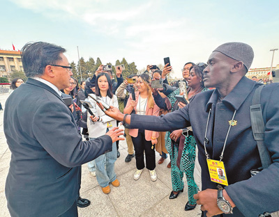 加納通訊社記者斯蒂芬·阿散蒂(右一)在中國(guó)全國(guó)兩會(huì)期間采訪。本報(bào)記者 馬 菲攝