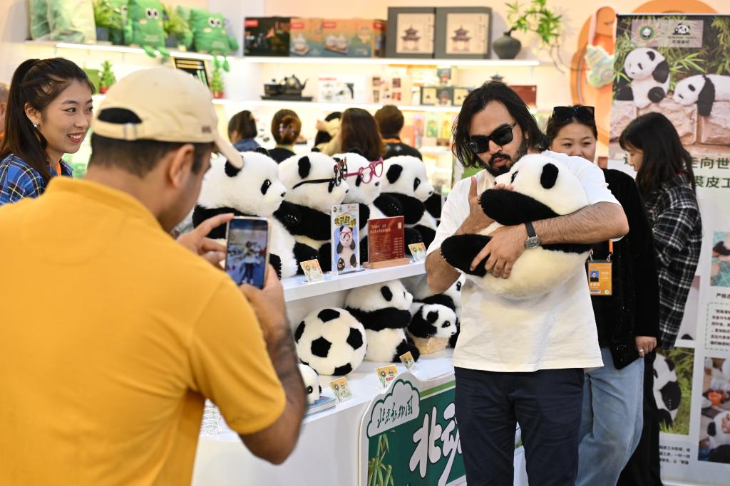 2024年9月16日,參觀者在2024年服貿(mào)會(huì)首鋼園區(qū)文旅服務(wù)專題展區(qū)抱著北京動(dòng)物園推出的大熊貓文創(chuàng)玩偶合影。新華社記者 李鑫 攝