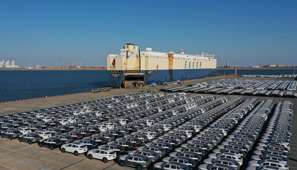 2025年2月25日,來自京津冀地區(qū)的超4000輛國(guó)產(chǎn)自主品牌汽車在天津港環(huán)球滾裝碼頭等待裝船發(fā)往海外(無人機(jī)照片)。新華社記者 趙子碩 攝