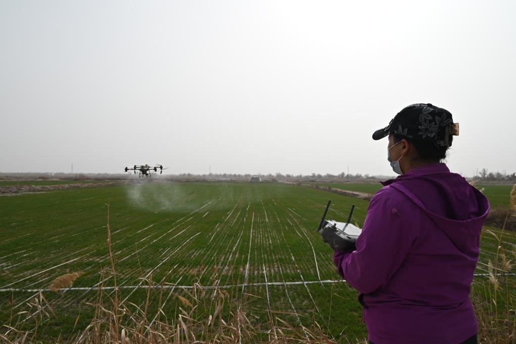 3月18日,在新疆喀什地區(qū)英吉沙縣一麥田,努日曼古麗正在操作無人機。新華社記者 尹茹紅 攝