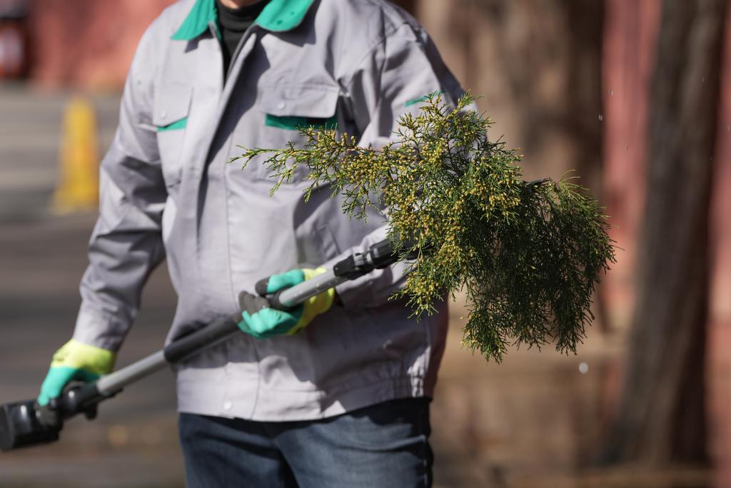 記者在位于北京東四環(huán)的紅領(lǐng)巾公園里看到,一輛水車尾燈雙閃、緩緩行進,站在車上的工作人員手持高壓水槍對圓柏開展沖淋作業(yè),花粉順著水流不斷落地。另一旁,園林工作人員對開花較多的枝條進行修剪。