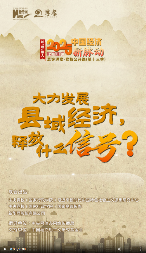 新一季“思客講堂·黨校公開(kāi)課”《理響中國(guó)·以理服人|2025中國(guó)經(jīng)濟(jì)新脈動(dòng)》,帶你讀懂2025年經(jīng)濟(jì)工作重點(diǎn)。“千億大縣”不斷擴(kuò)容,縣域消費(fèi)“多點(diǎn)開(kāi)花”,“縣域”二字越來(lái)越火,成為經(jīng)濟(jì)發(fā)展的關(guān)鍵詞。2025年政府工作報(bào)告和2024年中央經(jīng)濟(jì)工作會(huì)議都強(qiáng)調(diào)要大力發(fā)展縣域經(jīng)濟(jì),這釋放了什么信號(hào)?中央黨校(國(guó)家行政學(xué)院)社會(huì)和生態(tài)文明教研部教授王曉莉?qū)Υ诉M(jìn)行解讀。