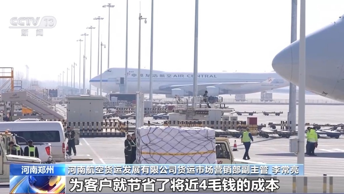 河南航空貨運(yùn)發(fā)展有限公司貨運(yùn)市場(chǎng)營(yíng)銷(xiāo)部 李常亮:時(shí)效能夠提升3到6個(gè)小時(shí),而且我們現(xiàn)在對(duì)中轉(zhuǎn)貨實(shí)行一次性收費(fèi),算下來(lái)相當(dāng)于我們一公斤為客戶(hù)就節(jié)省了將近4毛錢(qián)的成本。