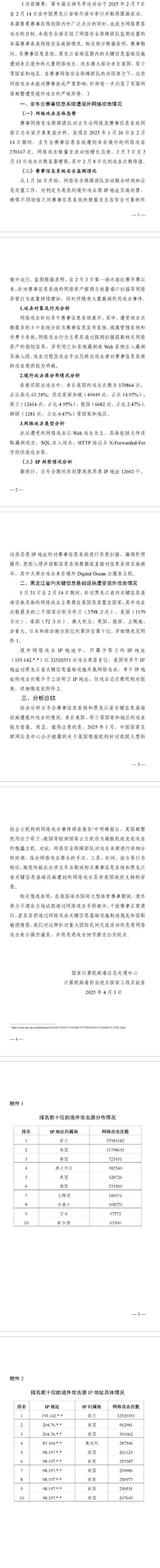 新華社哈爾濱4月3日電(記者王君寶 張建新)3日,國家計(jì)算機(jī)病毒應(yīng)急處理中心計(jì)算機(jī)病毒防治技術(shù)國家工程實(shí)驗(yàn)室發(fā)布“2025年哈爾濱第九屆亞冬會(huì)”賽事信息系統(tǒng)及黑龍江省內(nèi)關(guān)鍵信息基礎(chǔ)設(shè)施遭境外網(wǎng)絡(luò)攻擊情況監(jiān)測分析報(bào)告,內(nèi)容顯示2025年1月26日至2月14日期間,亞冬會(huì)賽事信息系統(tǒng)遭到來自境外的網(wǎng)絡(luò)攻擊達(dá)270167次。