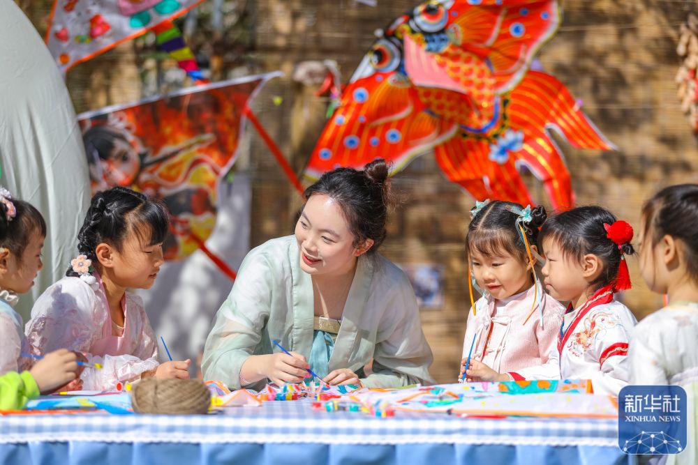 ↑ 4月2日,在山東省青島市李滄區(qū)青峰路幼兒園開(kāi)展的迎清明活動(dòng)中,老師指導(dǎo)小朋友繪制紙鳶。新華社發(fā)(張鷹攝)