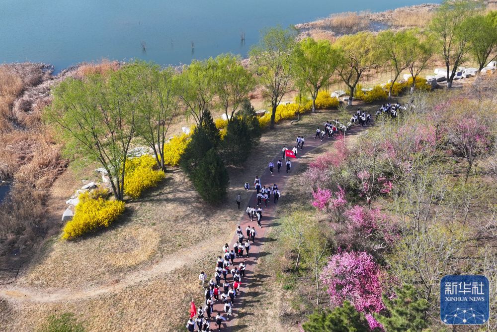 ↑ 4月3日,山東省高密市第五中學(xué)的中學(xué)生在膠河國(guó)家濕地公園參加踏青遠(yuǎn)足活動(dòng)(無(wú)人機(jī)照片)。新華社發(fā)(李海濤攝)