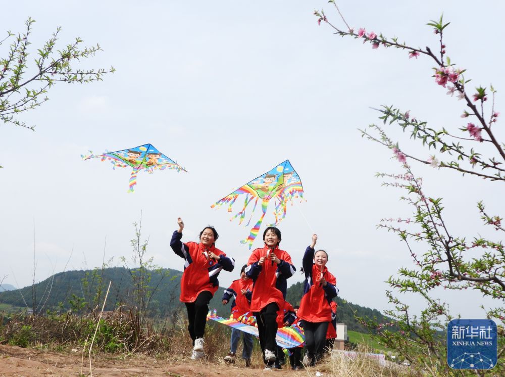 ↑ 4月3日,四川省達(dá)州市渠縣新市鎮(zhèn)第一小學(xué)學(xué)生在陽(yáng)光大課間放風(fēng)箏。新華社發(fā)(鄧良奎攝)