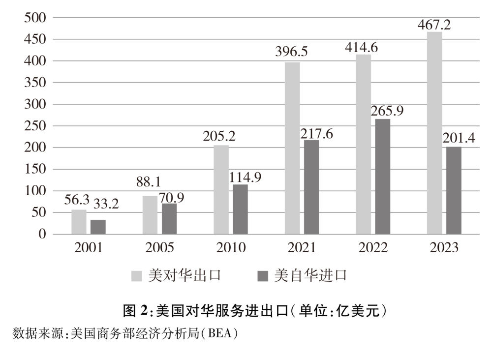 美國服務(wù)業(yè)產(chǎn)業(yè)門類齊全,具有較強國際競爭力??傮w來看,隨著經(jīng)濟不斷發(fā)展和人民生活水平提升,中國對服務(wù)需求明顯擴大,中美雙方服務(wù)貿(mào)易快速增長。據(jù)美國商務(wù)部統(tǒng)計,2001-2023年,中美服務(wù)貿(mào)易額由89.5億美元擴大到668.6億美元,增長了6倍(圖2)。根據(jù)中方統(tǒng)計,2023年,美國是中國第二大服務(wù)貿(mào)易伙伴;據(jù)美方統(tǒng)計,中國是美國第五大服務(wù)出口目的地。