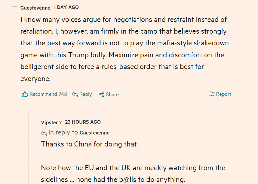 中國的嚴(yán)正立場也引發(fā)了同樣受到美國關(guān)稅影響的各國網(wǎng)民對中國的廣泛支持。在英國《金融時報》相關(guān)報道評論區(qū),獲贊最多的一條網(wǎng)友評論稱:“我知道有許多聲音主張通過談判和克制來解決問題,而不是采取反制行動。然而,我強烈認(rèn)為最好的前進(jìn)方式就是將好戰(zhàn)一方的痛苦和不適最大化,如此才能建立一個對所有人都有利的基于規(guī)則的秩序?!?/p>
