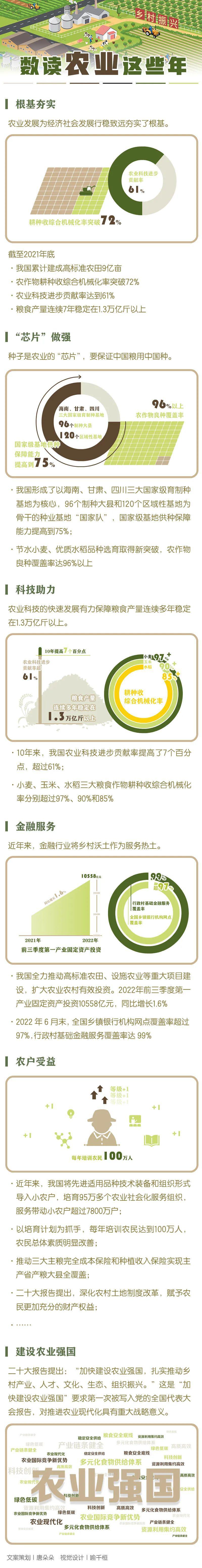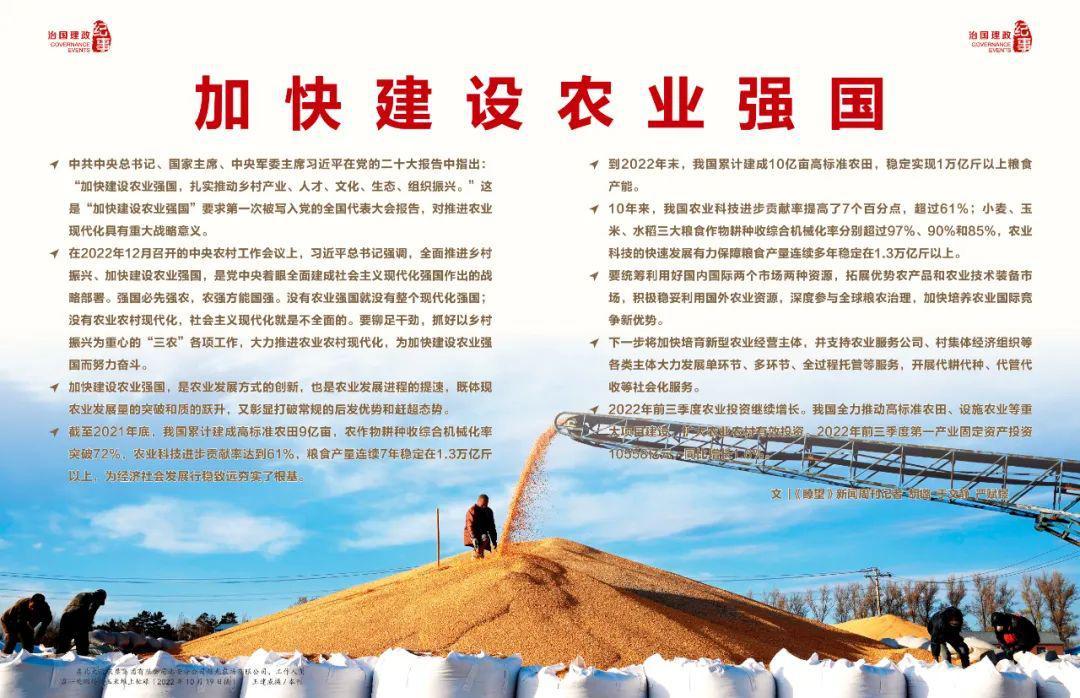 ◆ 中共中央總書(shū)記、國(guó)家主席、中央軍委主席習(xí)近平在黨的二十大報(bào)告中指出:“加快建設(shè)農(nóng)業(yè)強(qiáng)國(guó),扎實(shí)推動(dòng)鄉(xiāng)村產(chǎn)業(yè)、人才、文化、生態(tài)、組織振興?!边@是“加快建設(shè)農(nóng)業(yè)強(qiáng)國(guó)”要求第一次被寫入黨的全國(guó)代表大會(huì)報(bào)告,對(duì)推進(jìn)農(nóng)業(yè)現(xiàn)代化具有重大戰(zhàn)略意義。