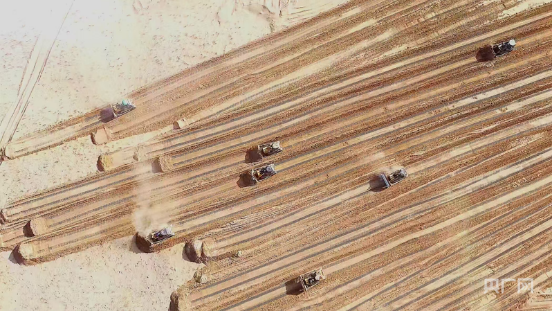 “民豐縣經(jīng)過無數(shù)次試驗(yàn),選擇蘆葦鋪設(shè)草方格沙障,帶動(dòng)了蘆葦收割產(chǎn)業(yè),參與收割的農(nóng)牧民人均增收7740元左右?!辟Z磊說。