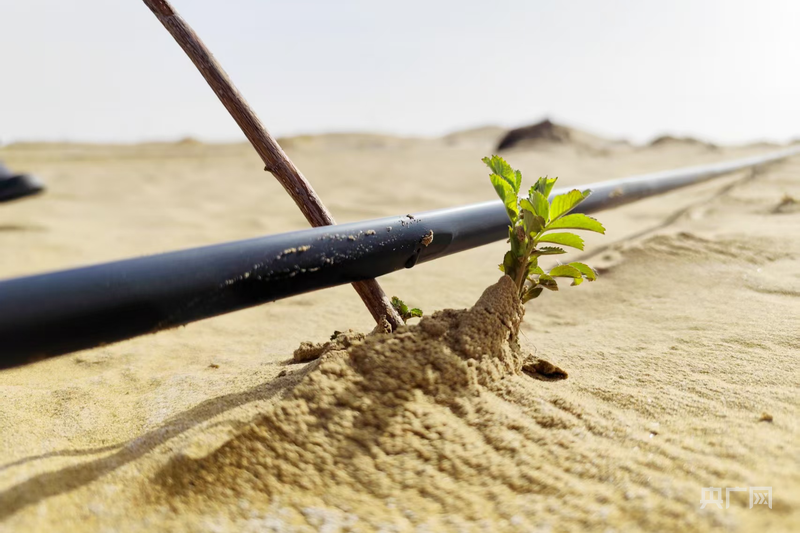數(shù)臺(tái)推土機(jī)以磅礴之勢推平連綿沙丘,為綠色的希望開辟道路;林草技術(shù)中心的技術(shù)人員與護(hù)林員協(xié)作栽種耐旱中草藥苗,每個(gè)動(dòng)作都飽含著對這片沙地的期待;去年完成塔克拉瑪干鎖邊合龍的區(qū)域,沙漠玫瑰沖破沙層露出新芽;滴灌帶的水滴有序落下,滋潤著這片干涸的沙漠,像一條條生命的脈絡(luò)延伸在廣袤沙?!?/p>