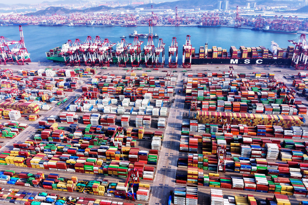 這是2月23日拍攝的山東港口青島港外貿(mào)集裝箱碼頭(無人機照片)。2025年以來,青島港開通2條到東南亞、地中海方向的“一帶一路”航線,合計新開4條國際集裝箱航線,加快世界一流海洋港口建設。新華社發(fā)(俞方平 攝)