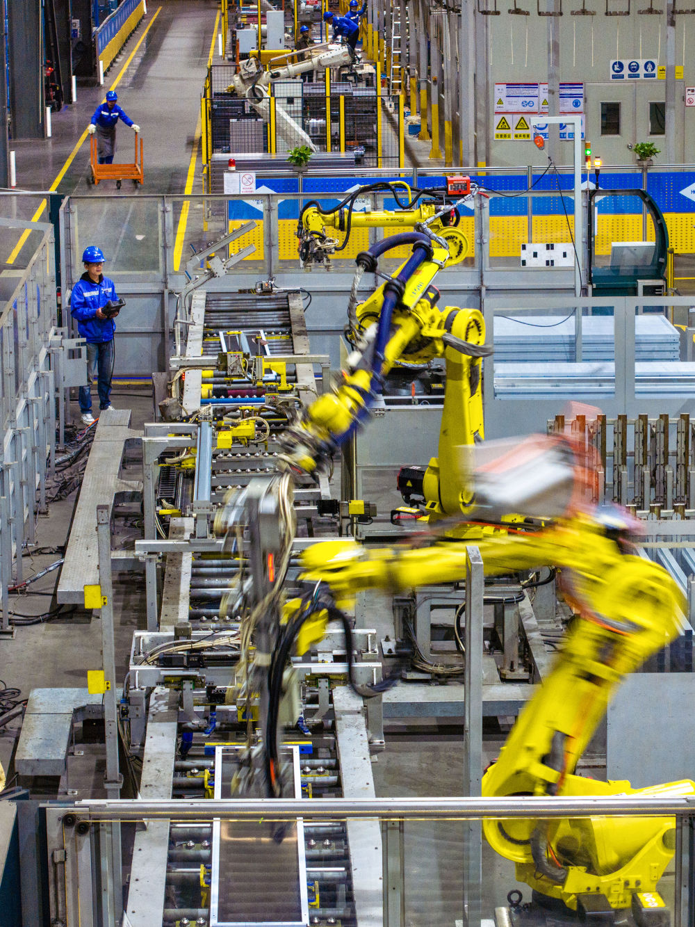3月29日,浙江省寧波宏大電梯有限公司的工人在生產(chǎn)線上忙碌(無人機照片)。