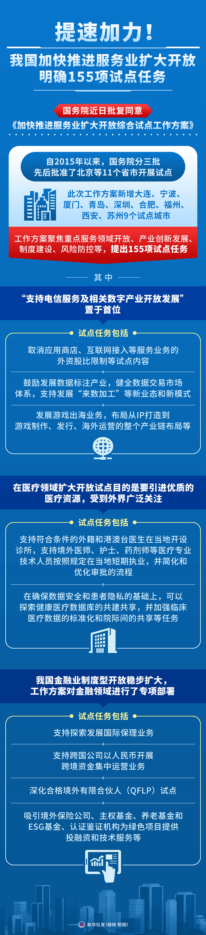 具體來看,工作方案聚焦重點服務(wù)領(lǐng)域開放、產(chǎn)業(yè)創(chuàng)新發(fā)展、制度建設(shè)、風(fēng)險防控等,提出155項試點任務(wù)。