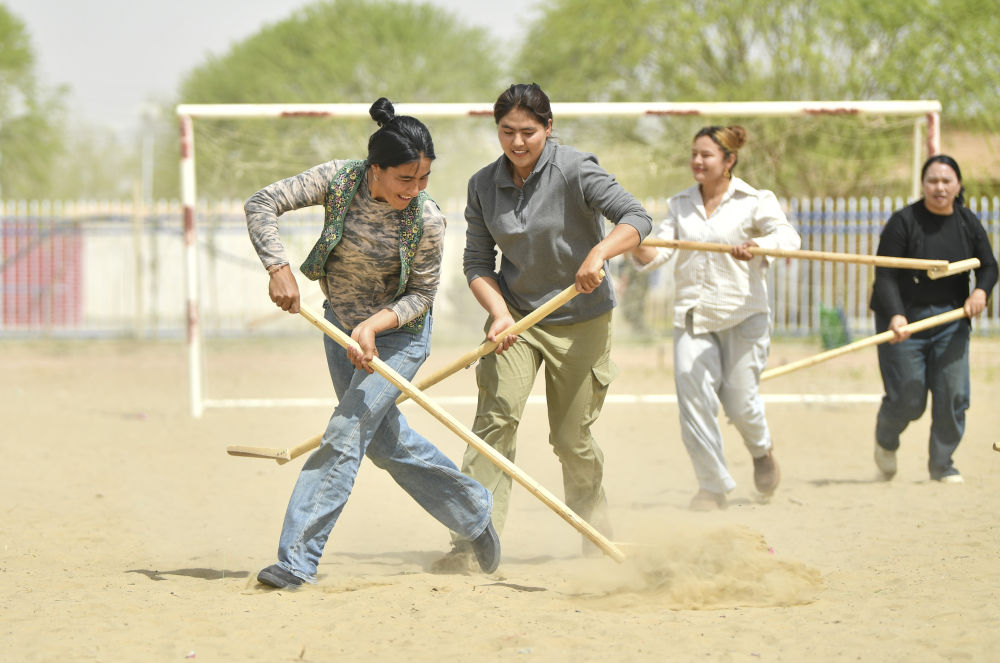 達(dá)里雅布依鄉(xiāng)女子麥熱球隊(duì)的訓(xùn)練場(chǎng)地,就是一片被胡楊、紅柳包圍著的沙地操場(chǎng)。麥熱球類似曲棍球,是一種在新疆和田地區(qū)廣泛流行的古老運(yùn)動(dòng)。這項(xiàng)群眾性運(yùn)動(dòng)并沒有過(guò)于嚴(yán)格的規(guī)則,一片空地,三五好友,興之所起,即可揮桿。2021年,麥熱球被正式列入國(guó)家級(jí)非物質(zhì)文化遺產(chǎn)代表性項(xiàng)目名錄。