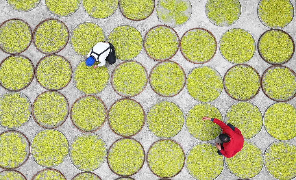 4月7日,在湖南省永州市雙牌縣上梧江瑤族鄉(xiāng)盤(pán)家村云臺(tái)山生態(tài)有機(jī)茶園,茶農(nóng)在攤曬春茶(無(wú)人機(jī)照片)。新華社發(fā)(何紅福攝)