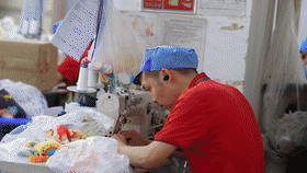 車(chē)間另一頭,品檢組組長(zhǎng)梁建敏正給玩具成品審核把關(guān)。梁建敏很瘦,但很有能量,拖貨、倒貨、檢查貨,好像總有使不完的力氣,臉上總是掛著陽(yáng)光般的笑容,眼睛里充滿(mǎn)對(duì)工作的熱忱。她驗(yàn)貨時(shí)不單用眼睛,還會(huì)把毛絨玩具貼近耳朵來(lái)聽(tīng)。