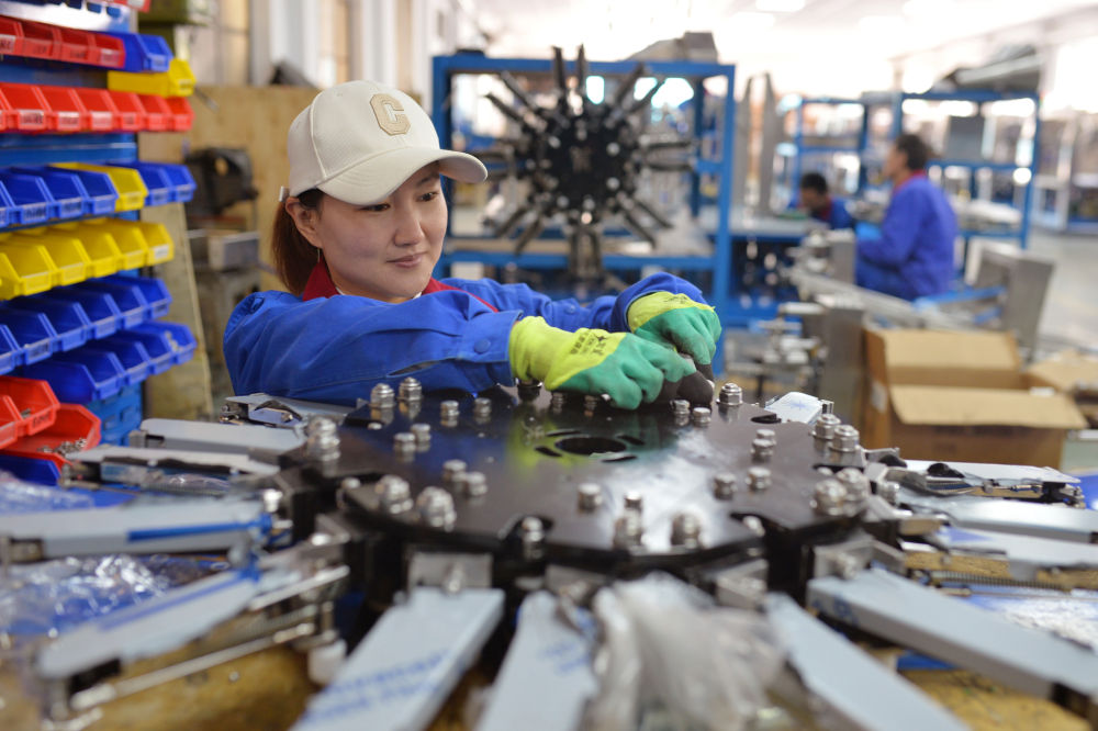 3月30日,在山東省青島市城陽(yáng)區(qū)夏莊街道青島義龍裝備制造股份有限公司生產(chǎn)車(chē)間內(nèi),工人在組裝包裝機(jī)。新華社發(fā)(王海濱攝)