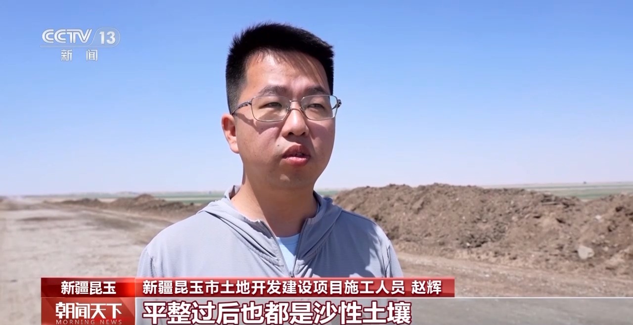 新疆昆玉市土地開發(fā)建設(shè)項(xiàng)目施工員 趙輝:這邊原本都是沙漠原始地貌,平整過后也都是沙性土壤,沙土的營養(yǎng)貧瘠,肥力差,抓一把土,能從指縫里漏掉90%。通過羊糞和水溶肥的有效結(jié)合,施進(jìn)去之后,我們能把沙土的結(jié)構(gòu)團(tuán)?;?,簡單來說就是把一團(tuán)散沙變成緊密有孔隙的小團(tuán)體,這樣施進(jìn)去的水和營養(yǎng)都能留存住。